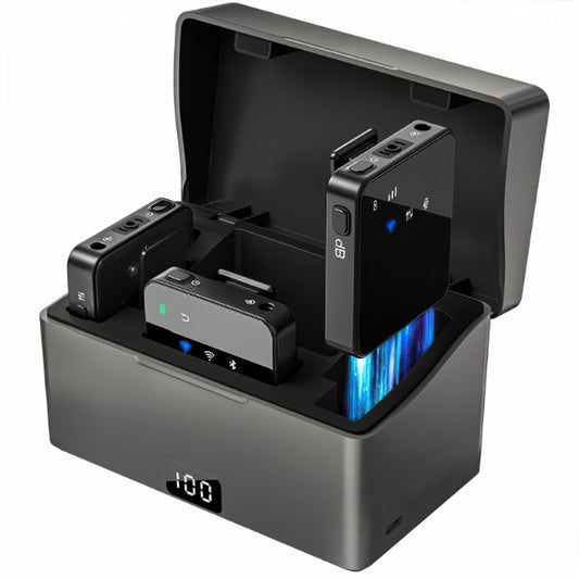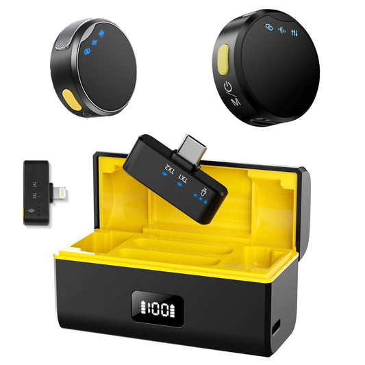 Set 2 microfoane lavaliera profesionale wireless, conectare 2.4G, 3 adaptoare separate type C, lightning si camera, Indicatori led, fara fir, prindere magnetica sau tip lant, plug & play